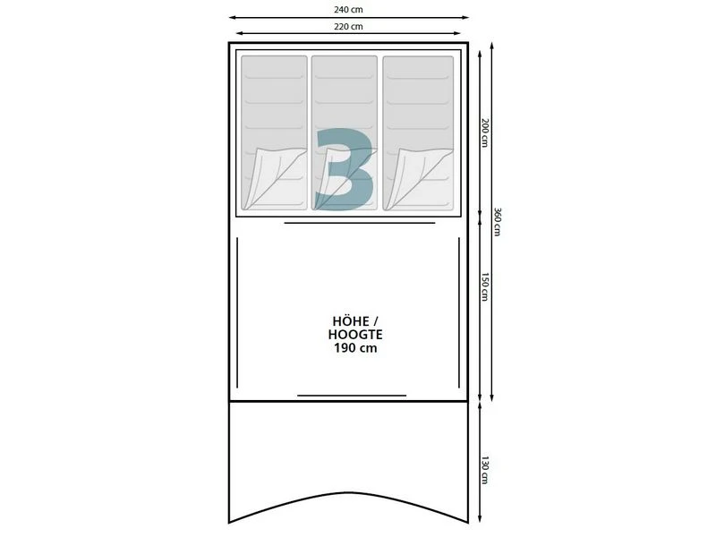 Afmeting: 240 x 360 cm (240 x 490 cm incl. luifel)