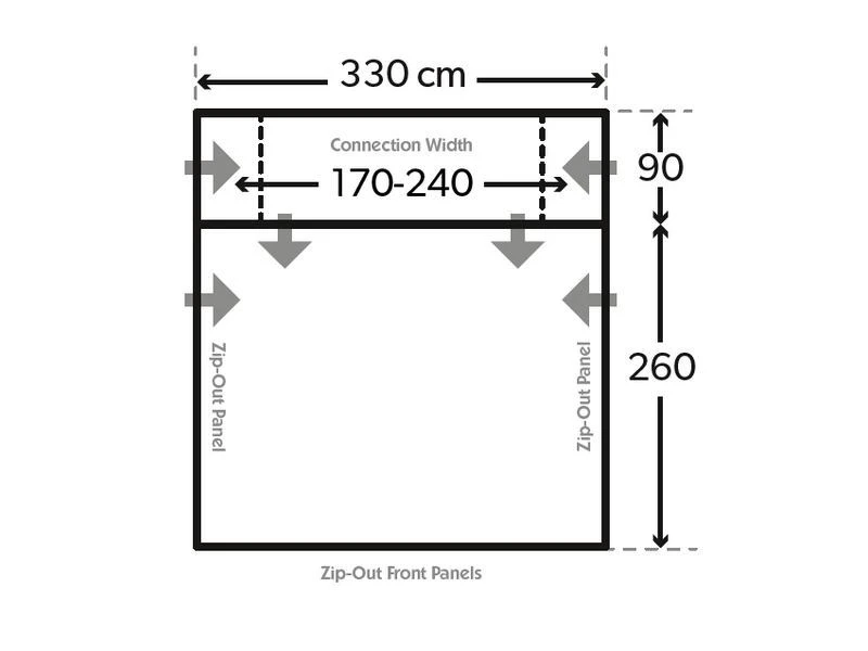 Vrijstaande tent, breedte 330 cm. Hoogte 220-300 cm.